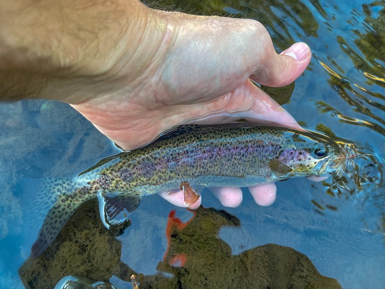 Using the rod’s length to keep the line high and the fly afloat, I bounced the fly atop the water like an October caddis laying its eggs. To my surprise, another similar-sized rainbow rose for the fly. It’s possible that another seasoned angler could find equivalent success on a new waterbody in a scenario like that. Still, I take comfort in telling myself that an unlikely second fish rose because I know how to fish “my stream.”