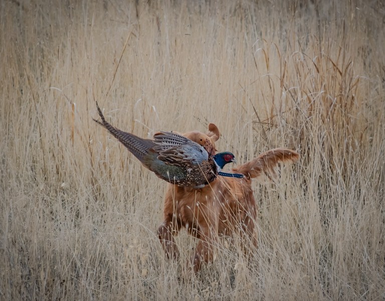 Young golden retriever, Scout, delivers a wily ring-neck rooster to hand.
