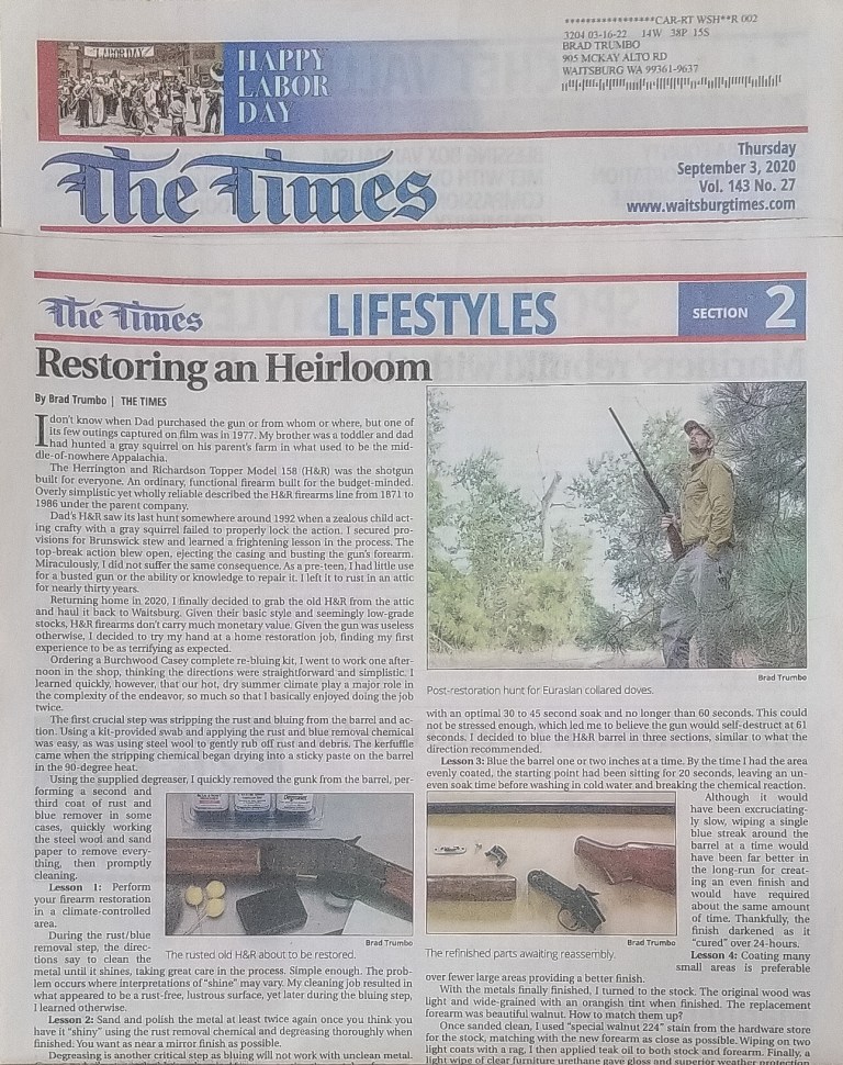 I don’t know when dad purchased the gun or from whom or where, but one of its few outings captured on film was in 1981. Dad had hunted a gray squirrel on his parent’s farm in what used to be the middle-of-nowhere Appalachia. The Herrington and Richardson Topper Model 158 (H&R) was the shotgun built … Read more Palouse Outdoors – Restoring an Heirloom