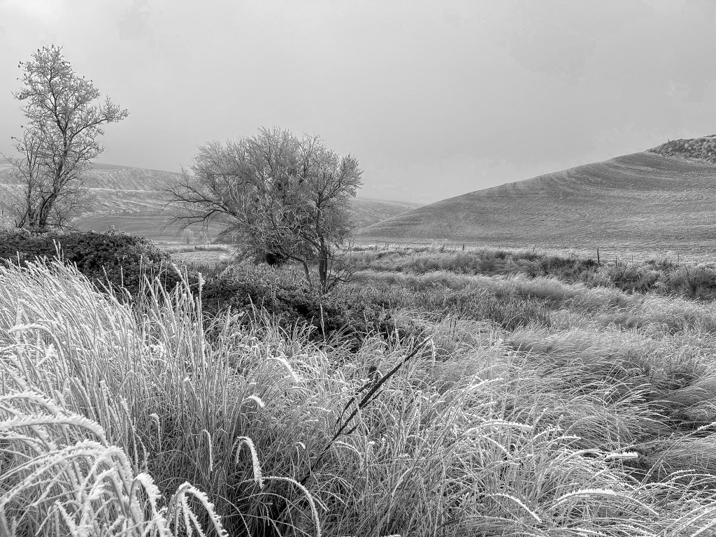 Beneath the fog on a still morning, the Palouse can be deafeningly quiet. The ominous croak of a midnight-black raven can be heard for miles. The slightest whisp of wind sends the big bunchgrasses into a cracking sway like the crinkling of a mylar balloon. And while the frosty, foggy days feel as though they have locked the landscape down for eternity, a mere hour of sun can free the Palouse from the grips of the icy chains.”