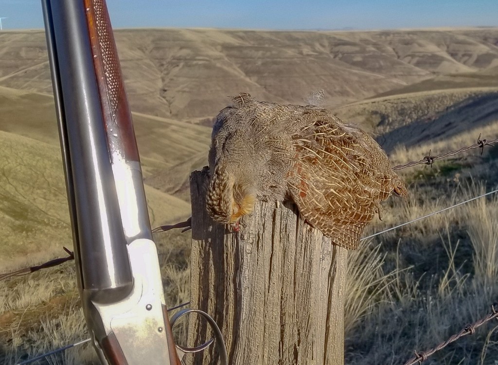 Approaching the edge, I spied Yuba standing staunch, tail high, with Finn cautiously backing. Hastily, I circled wide, approaching from the front to pin the bird between us. At ten feet out, Yuba’s penetrating gaze identified a thick round of bunchgrass three paces to my right. Turning to face the unseen bird triggered an eruption of parting bunchgrass with the onset of heavy wing beats. A splendid wild rooster gained altitude over a backdrop of rolling golden wheat and grassland.